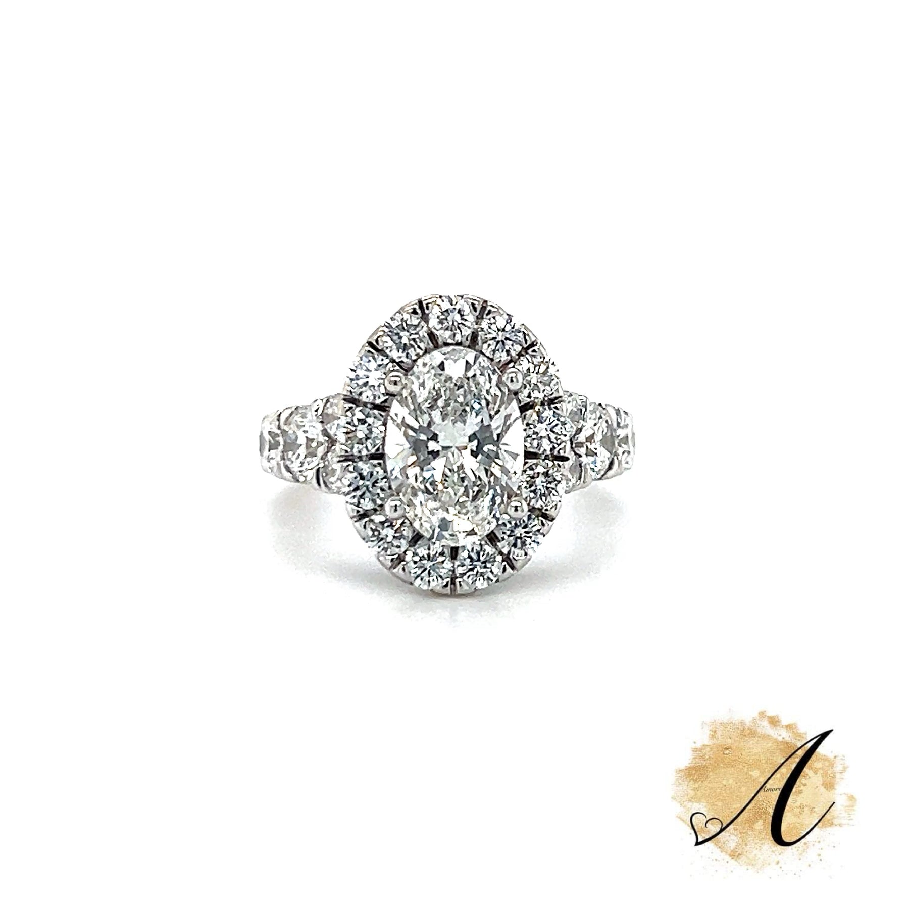 This breathtaking 2 carat oval halo diamond engagement ring features a 2.00 carat lab-grown center diamond, expertly cut and graded E color and VS1 clarity for exceptional brilliance and purity. Encircling the center stone is a radiant halo of 13 lab-grown round diamonds and 10 lab-grown round diamonds on the shank with 2 lab-grown round diamonds in the under galley totaling an impressive 1.84 carats creating a seamless flow of sparkle. The elegant oval shape elongates the finger while the halo adds dimension and intensity to the ring’s overall radiance. Sophisticated and modern, this ring is a striking expression of refined beauty and enduring love.