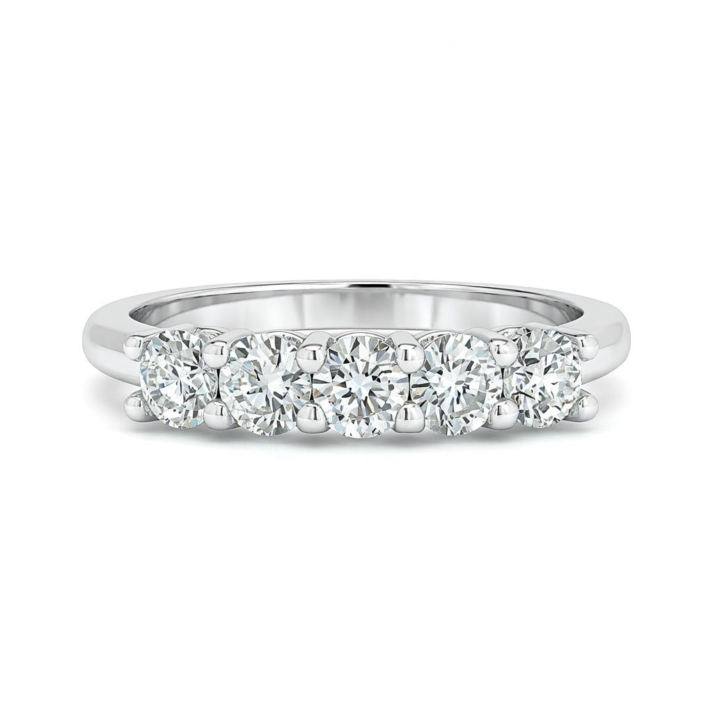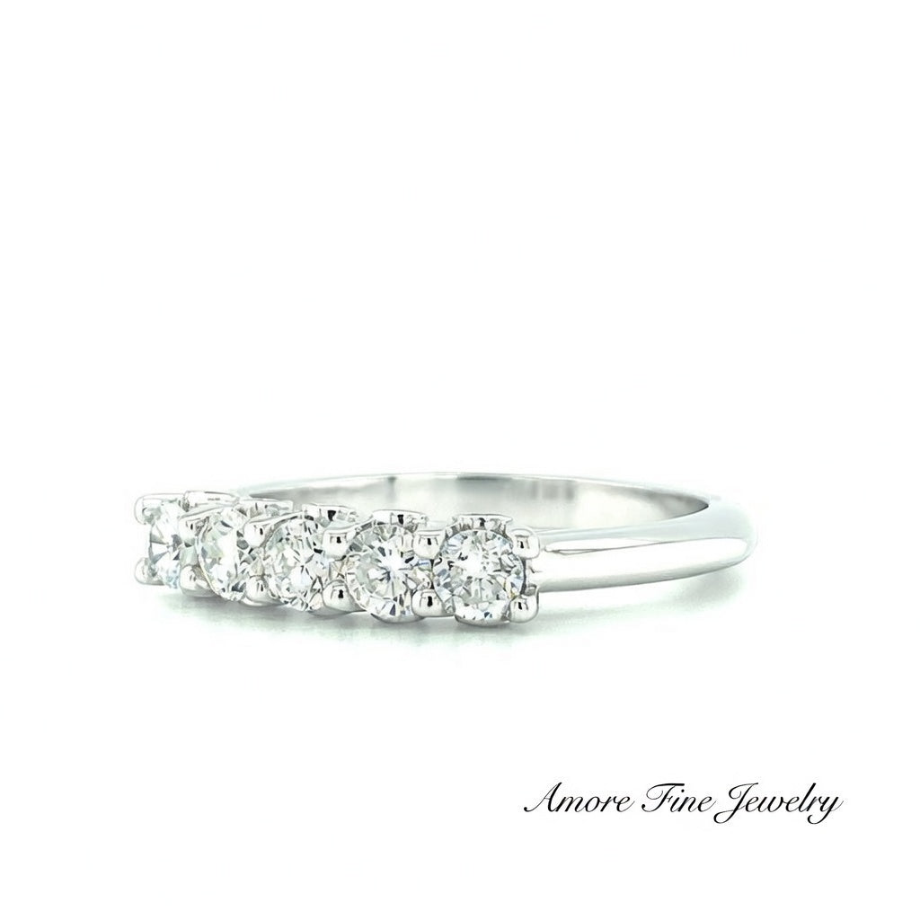This Diamond Shared Prong Wedding Ring Has 5 Natural Round Brilliant Cut Diamonds .59 Carat and 8 Natural Round Brilliant Cut Diamonds .07 Carat on the Front and Back. All Have "G" Colors and VS2 Clarity's Set in 14kt White Gold in a Size 6 1/2.