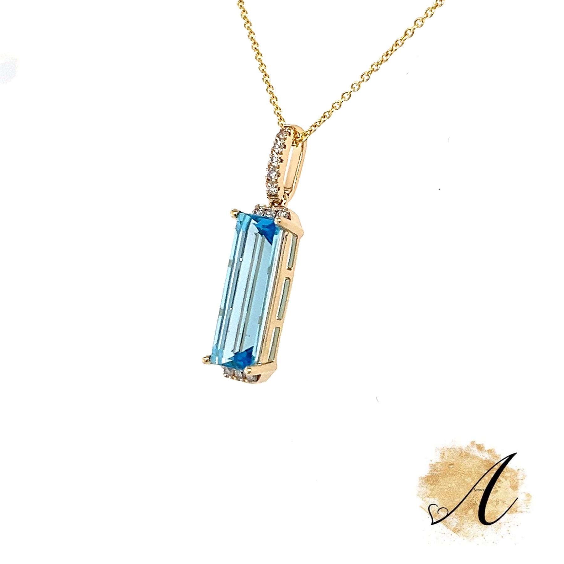 This Elongated Blue Topaz Pendant Has a 15mm X 5mm Genuine Blue Topaz and 11 Natural Round Brilliant Cut Diamonds .10 Carat Set in 14kt Yellow Gold on a 16" 14kt Yellow Gold 1.3 Gram Rolo Chain.