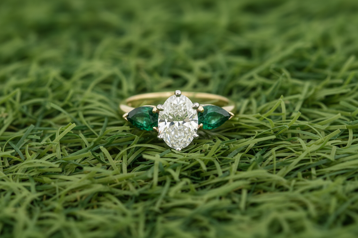 This Oval Lab Grown Diamond and Emerald Engagement Ring Has a 1.19 Carat G VS1 IGI Certified Diamond Set in a 18kt Gold Mounting With 2 Pear Shape Columbian Emeralds .61 Carat.